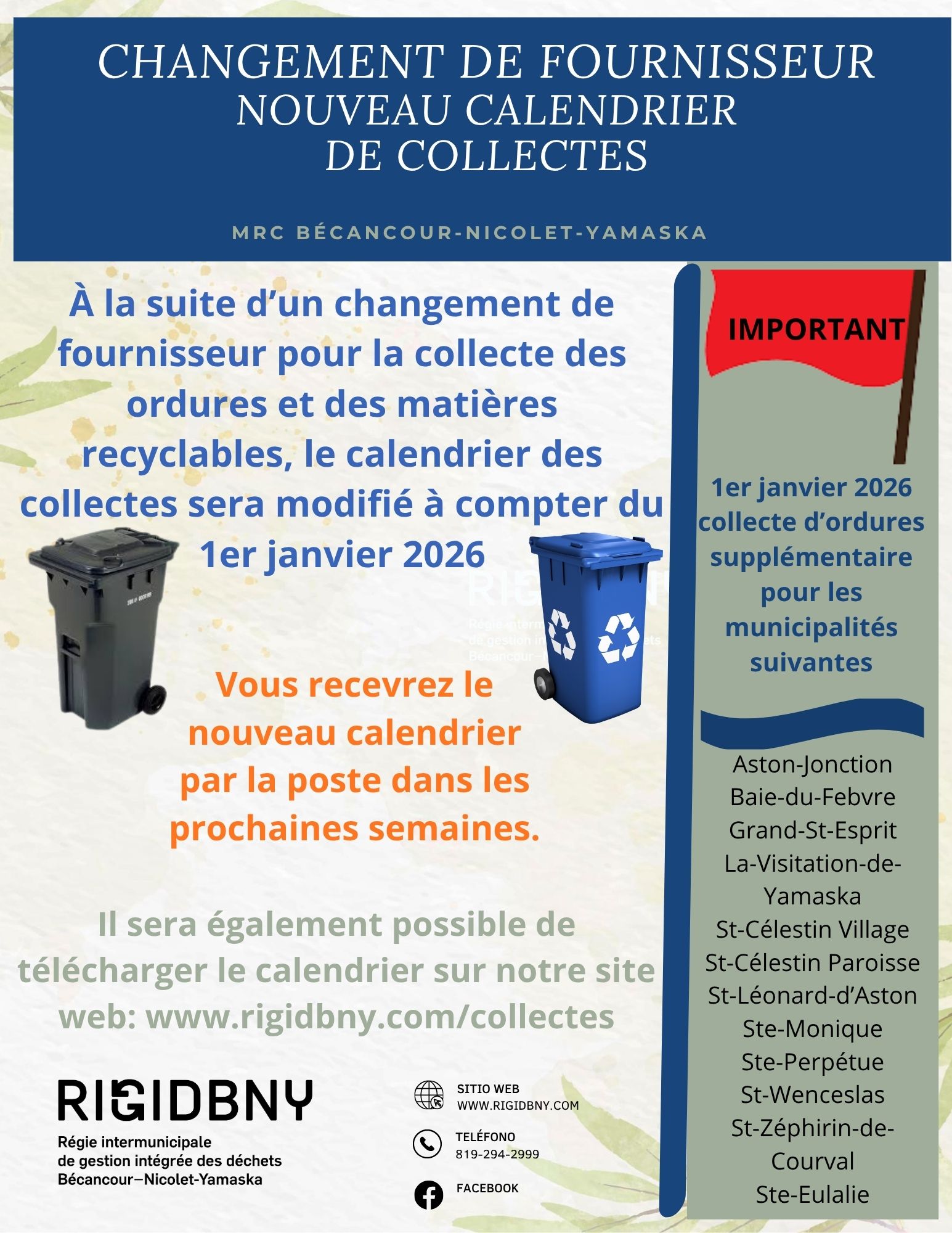 Texte : À la suite d'un changement de fournisseurs pour la collecte des ordures et des matières recyclables, le calendrier des collectes changera à partir du 1er janvier 2026. Vous recevrez le nouveau calendrier prochainement par la poste.