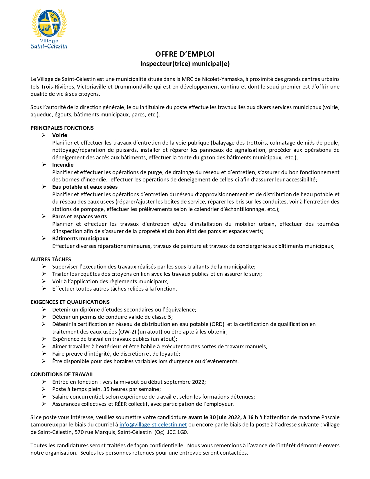 OFFRE D'EMPLOI - INSPECTEUR(TRICE) MUNICIPAL(E)