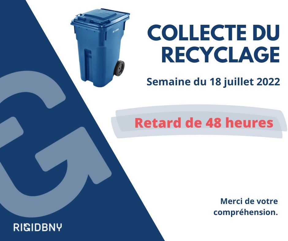 Semaine du 18 juillet: Dû à un manque de camionneurs, un retard de la collecte du recyclage de 48 heures est possible. Merci de laisser votre bac en bordure de chemin pour un délai de 48 heures ouvrables. En cas d'oubli, merci de signaler celui-ci après ce délai à la RIGIDBNY https://www.rigidbny.com/