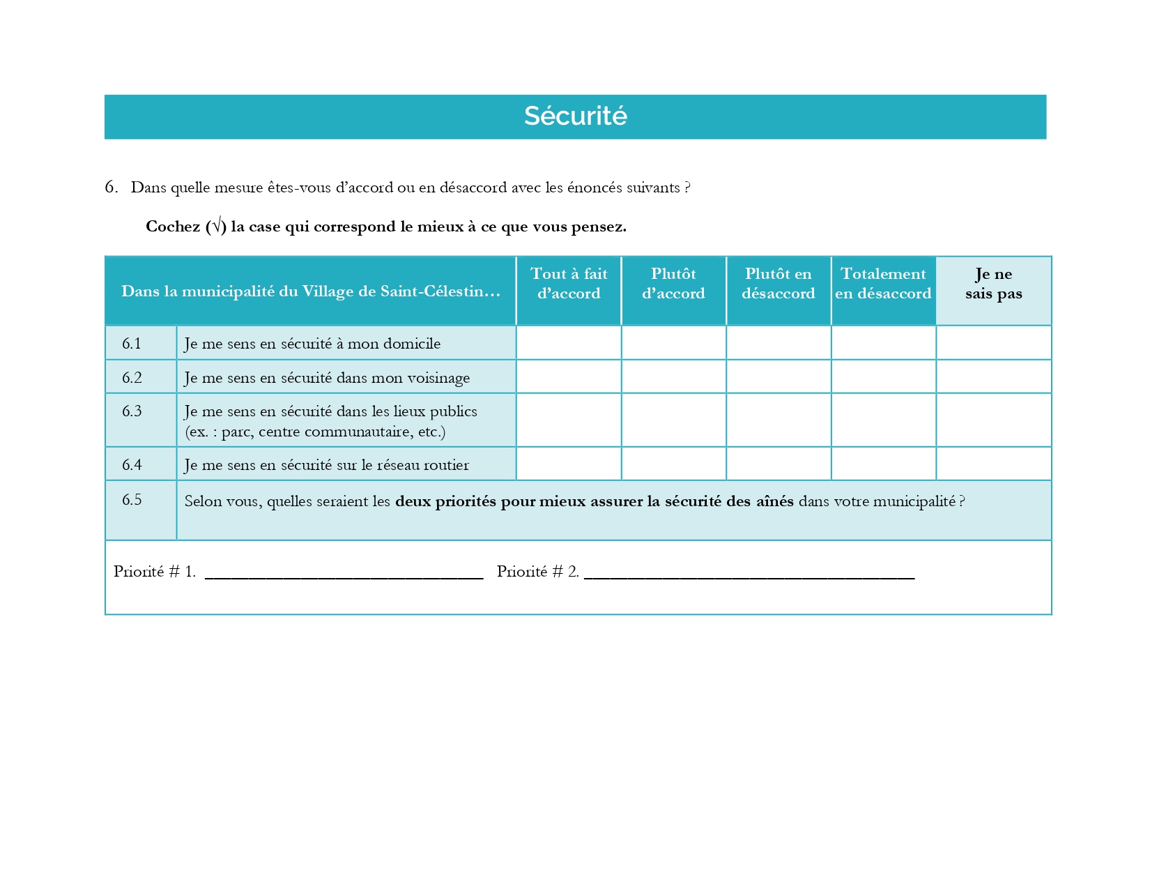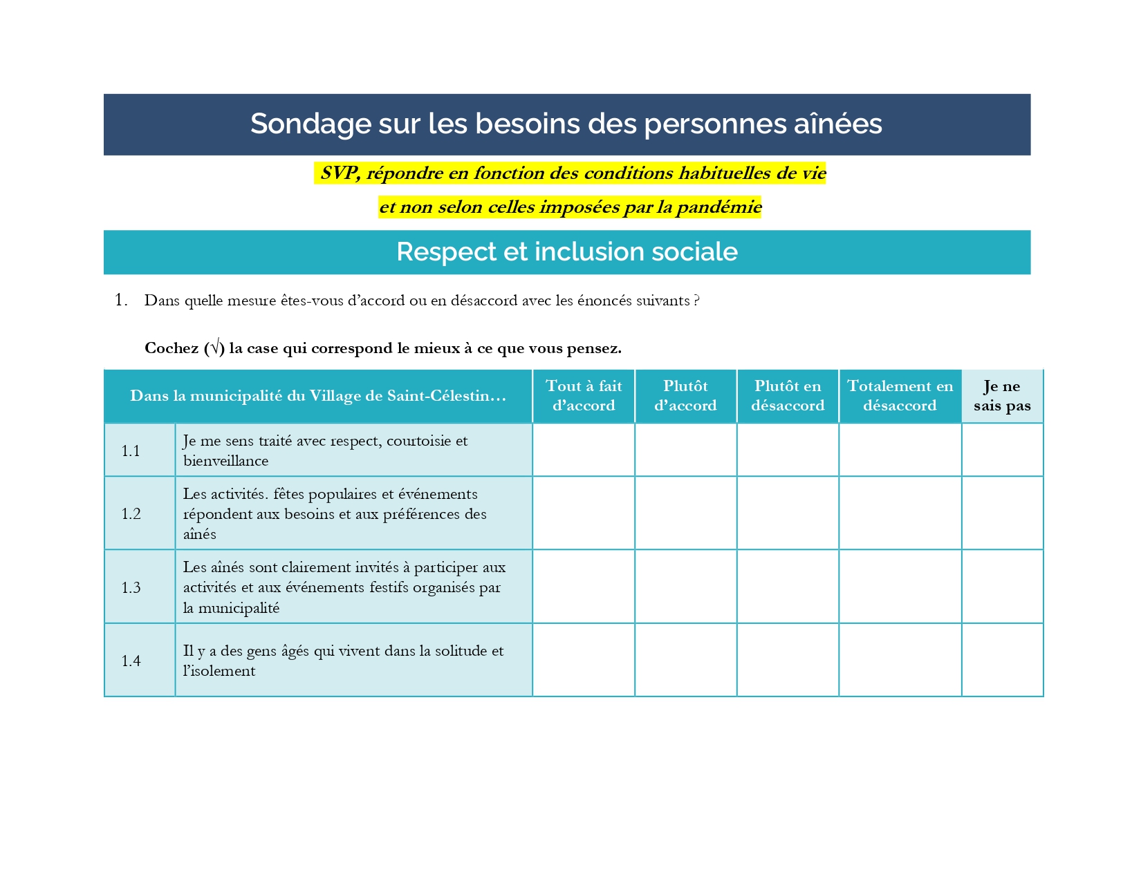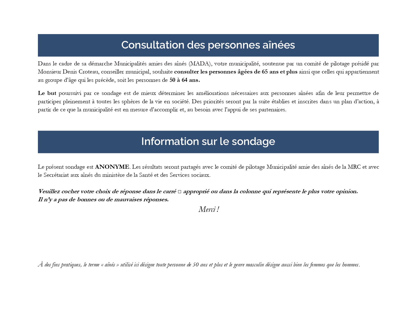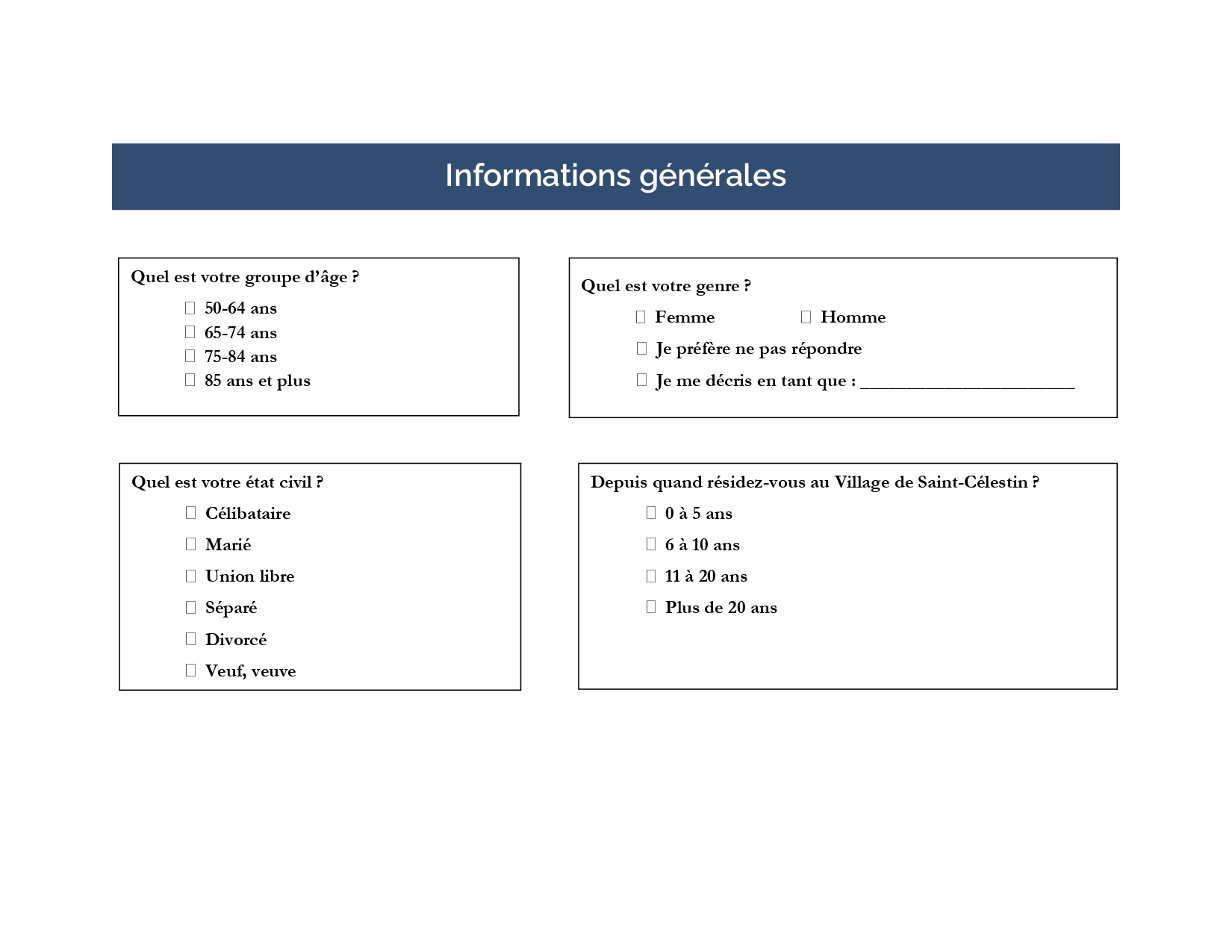 Consultation des personnes aînées du Village de Saint-Célestin dans le cadre de la Démarche Municipalité amie des aînés (MADA). CE SONDAGE S'ADRESSE AUX PERSONNES DE 50 ANS ET PLUS. Une fois rempli, veuillez retourner ce sondage à l'Hôtel de ville situé au 570 rue Marquis à Saint-Célestin ou par courriel à reception@village-st-celestin.net Des copies papiers y sont également disponibles. Merci pour votre participation!