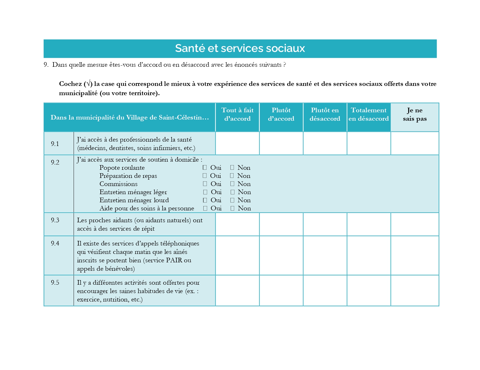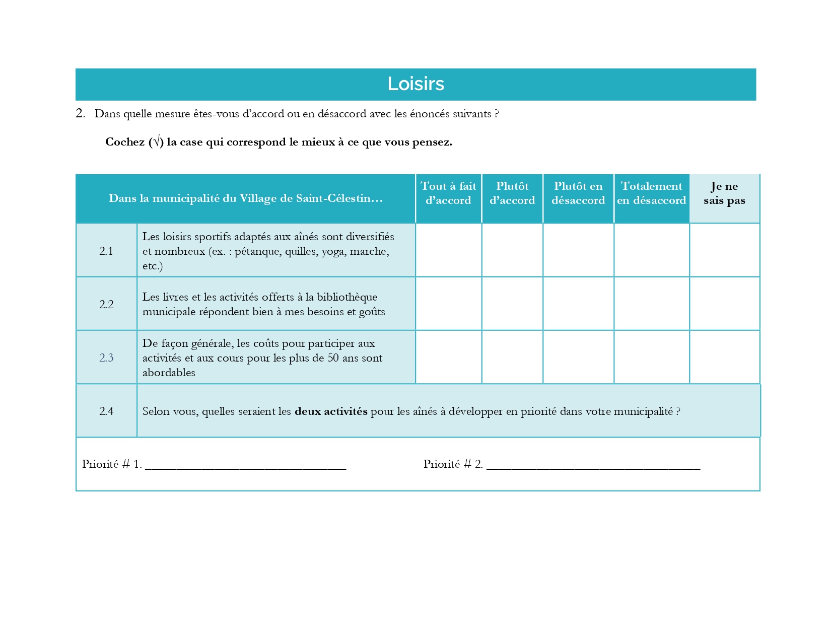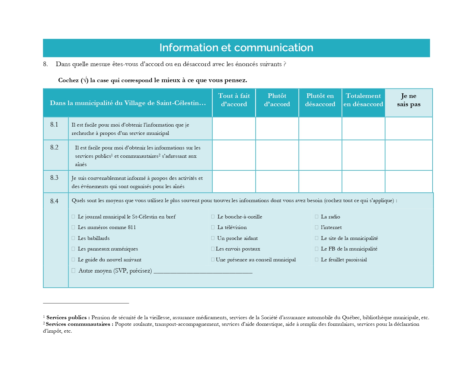 Consultation des personnes aînées du Village de Saint-Célestin dans le cadre de la Démarche Municipalité amie des aînés (MADA). CE SONDAGE S'ADRESSE AUX PERSONNES DE 50 ANS ET PLUS. Une fois rempli, veuillez retourner ce sondage à l'Hôtel de ville situé au 570 rue Marquis à Saint-Célestin ou par courriel à reception@village-st-celestin.net Des copies papiers y sont également disponibles. Merci pour votre participation!