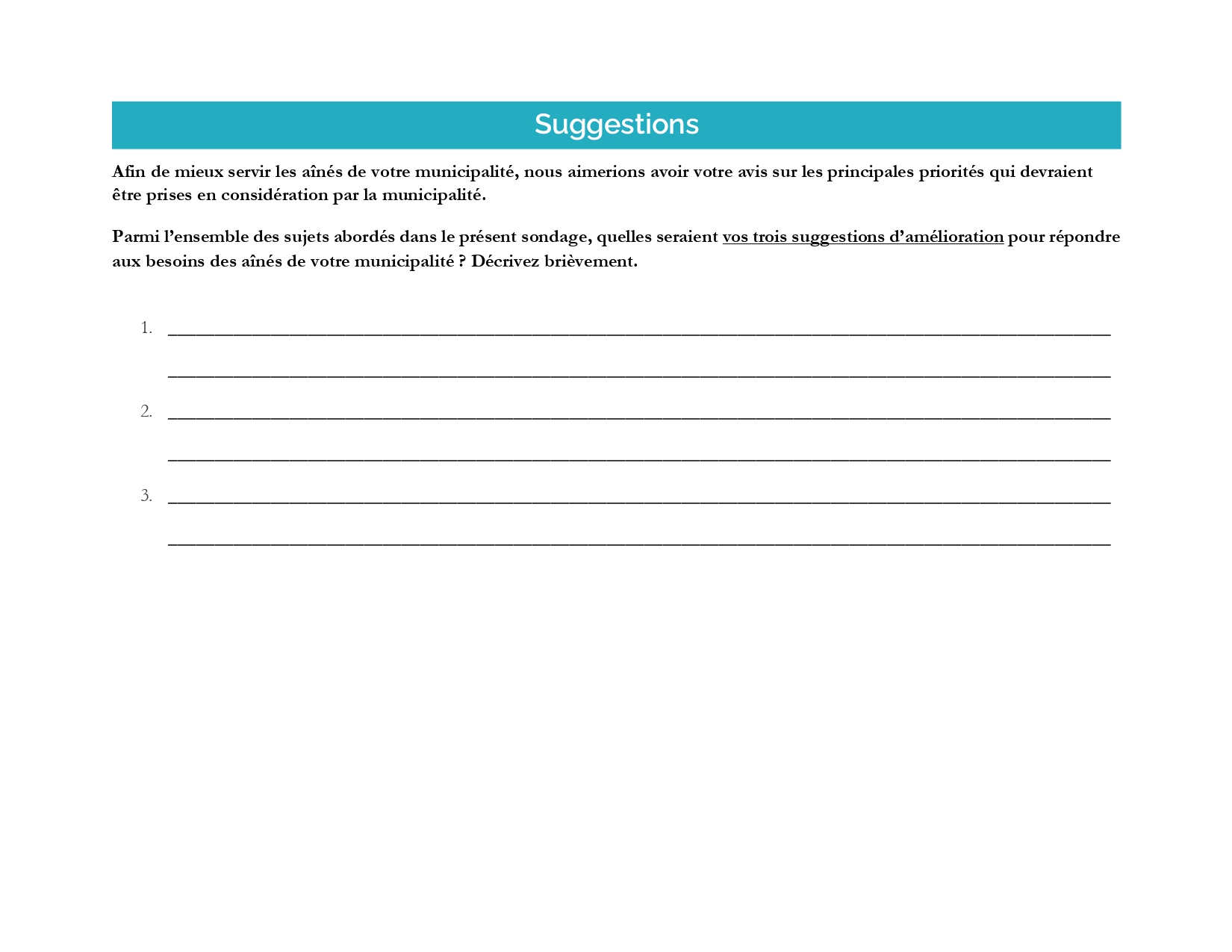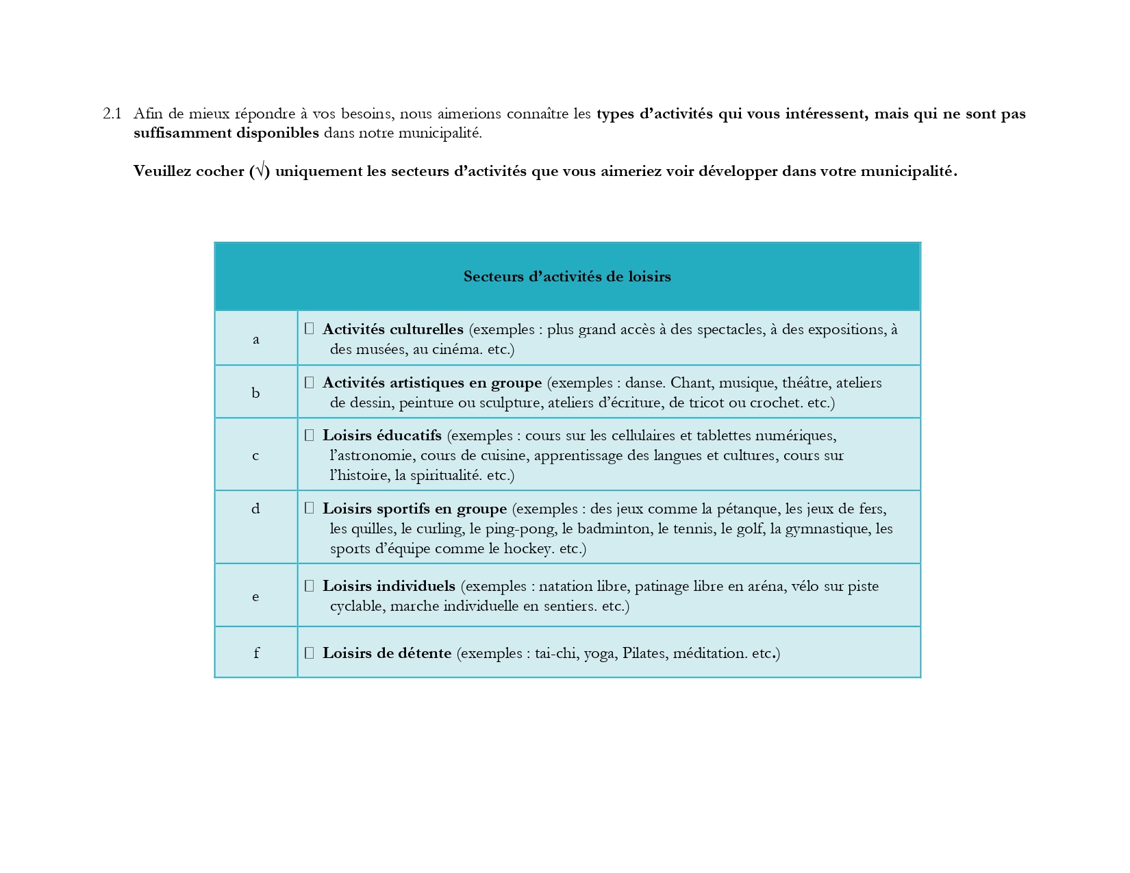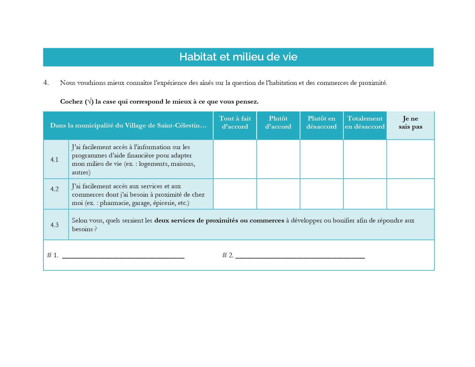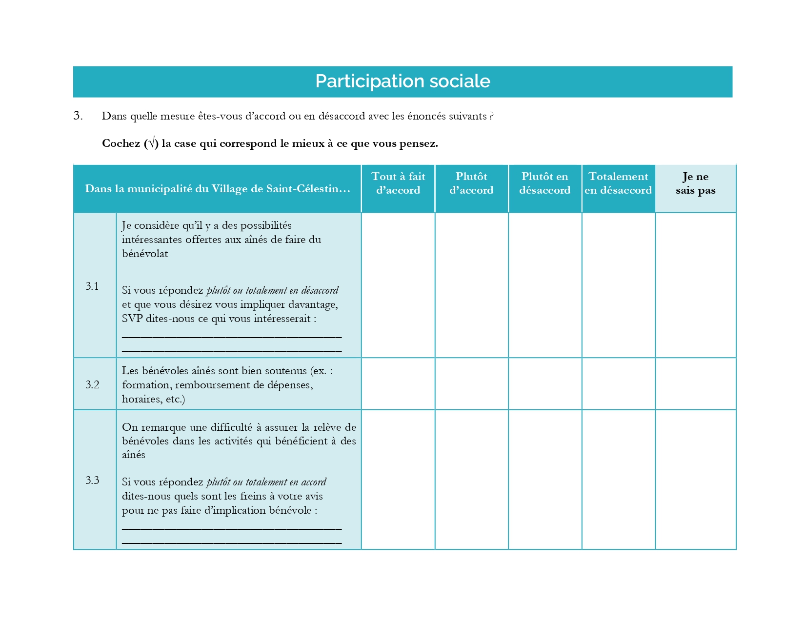 Consultation des personnes aînées du Village de Saint-Célestin dans le cadre de la Démarche Municipalité amie des aînés (MADA). CE SONDAGE S'ADRESSE AUX PERSONNES DE 50 ANS ET PLUS. Une fois rempli, veuillez retourner ce sondage à l'Hôtel de ville situé au 570 rue Marquis à Saint-Célestin ou par courriel à reception@village-st-celestin.net Des copies papiers y sont également disponibles. Merci pour votre participation!