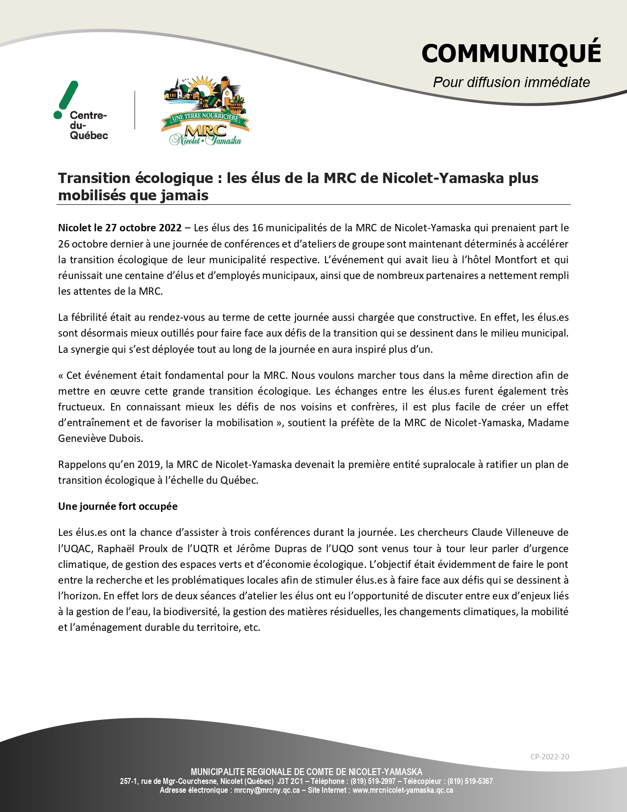 « Cet événement était fondamental pour la MRC. Nous voulons marcher tous dans la même direction afin de mettre en ?uvre cette grande transition écologique. Les échanges entre les élus.es furent également très fructueux. En connaissant mieux les défis de nos voisins et confrères, il est plus facile de créer un effet d'entraînement et de favoriser la mobilisation », soutient la préfète de la MRC de Nicolet-Yamaska, Madame Geneviève Dubois.