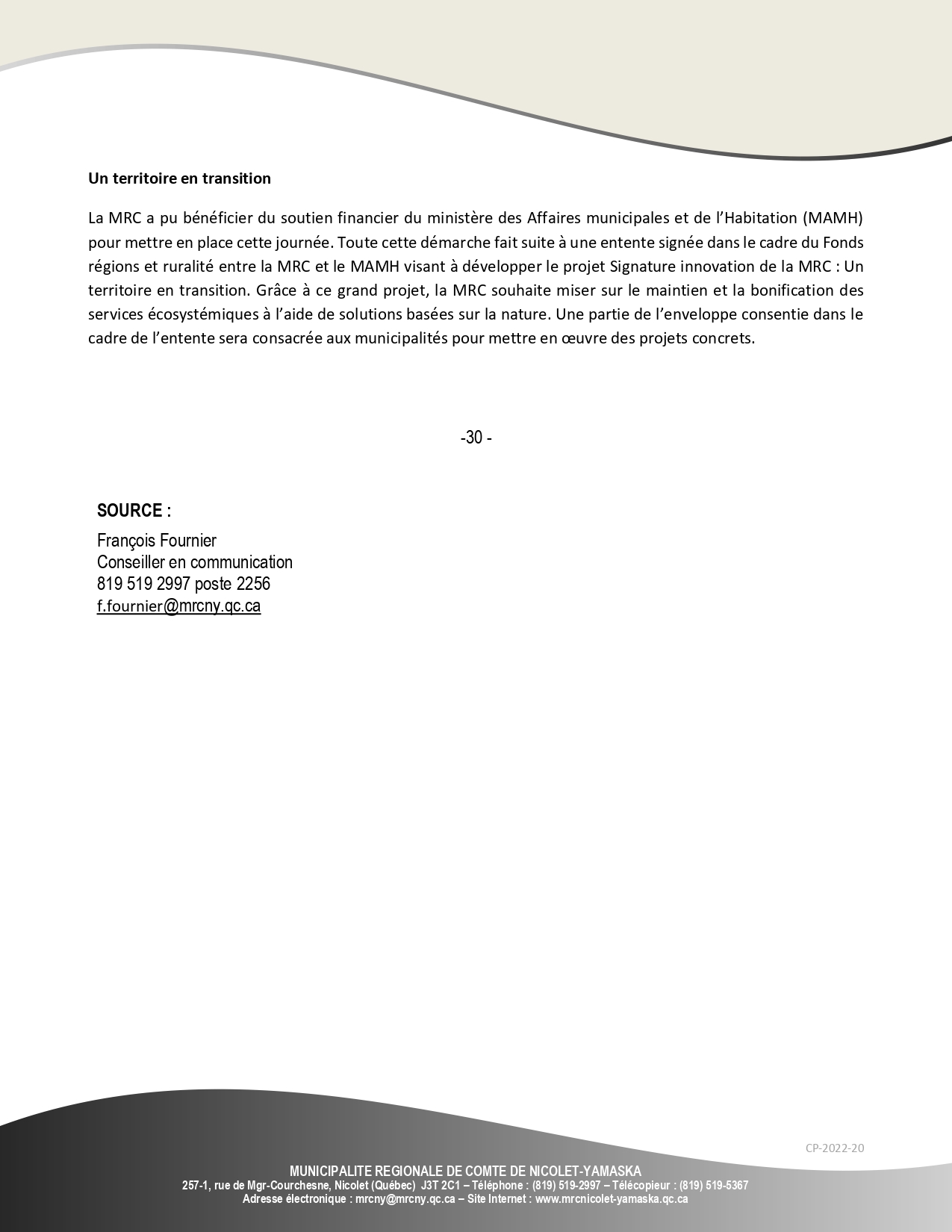 La MRC a pu bénéficier du soutien financier du ministère des Affaires municipales et de l'Habitation (MAMH) pour mettre en place cette journée. Toute cette démarche fait suite à une entente signée dans le cadre du Fonds régions et ruralité entre la MRC et le MAMH visant à développer le projet Signature innovation de la MRC : Un territoire en transition. Grâce à ce grand projet, la MRC souhaite miser sur le maintien et la bonification des services écosystémiques à l'aide de solutions basées sur la nature. Une partie de l'enveloppe consentie dans le cadre de l'entente sera consacrée aux municipalités pour mettre en ?uvre des projets concrets.