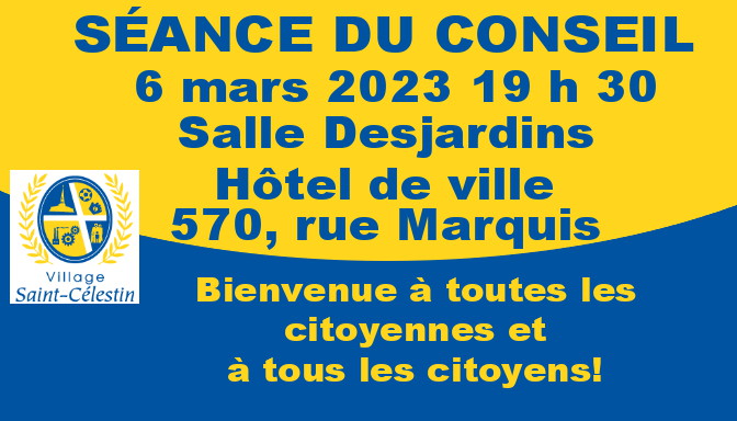 La prochaine séance ordinaire du conseil municipal aura lieu lundi le 6 MARS 2023.  Elle débutera à 19 h 30 et se déroulera à la salle Desjardins de l'hôtel de ville situé au 570, rue Marquis.