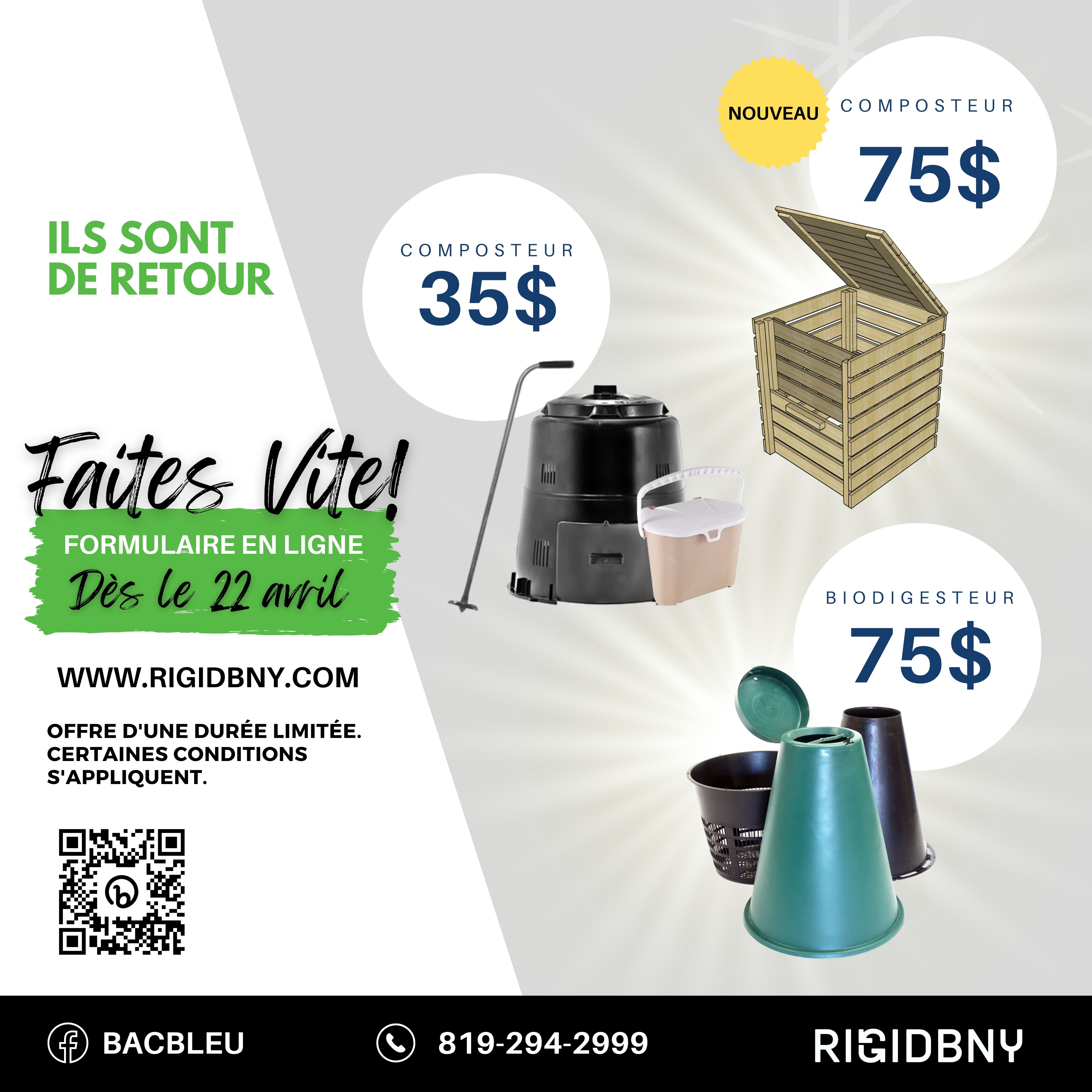 Ils sont de retour! Faites vite! Formulaire en ligne sur le site internet de la Régie intermunicipale de gestion intégrée des déchets de Bécancour/Nicolet-Yamaska RIGIDBNY dès le 22 avril. Offre d'une durée limitée. Certaines conditions s'appliquent.