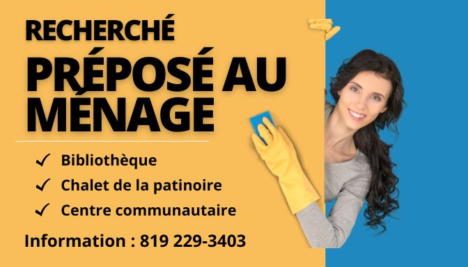 Nous sommes à la recherche d'un(e) préposé(e) au ménage pour la Bibliothèque Claude-Bouchard, le chalet de la patinoire ainsi que pour le Centre communautaire. Pour plus d'information vous pouvez communiquer au 819-229-3403 ou par courriel à loisirs.stcelestin@yahoo.ca.