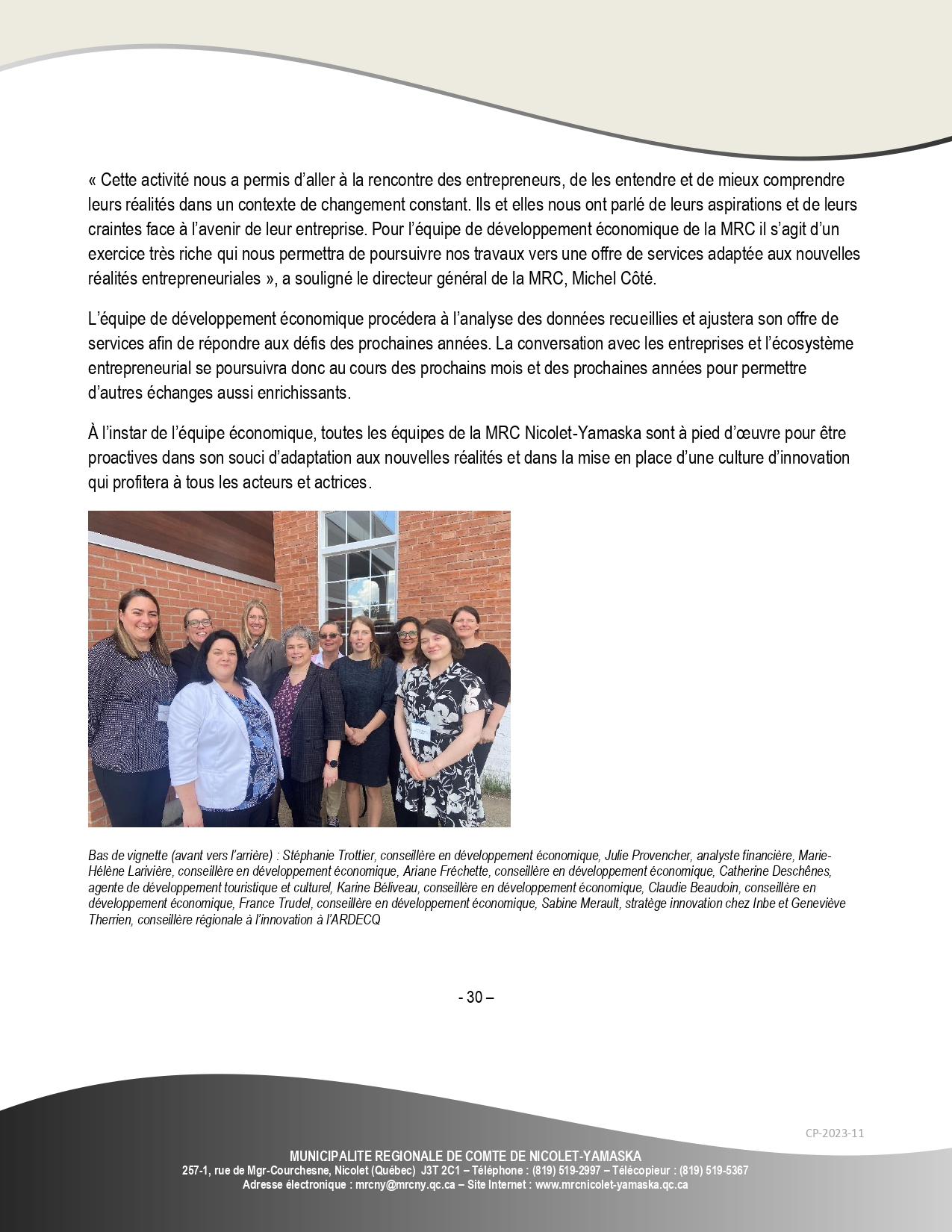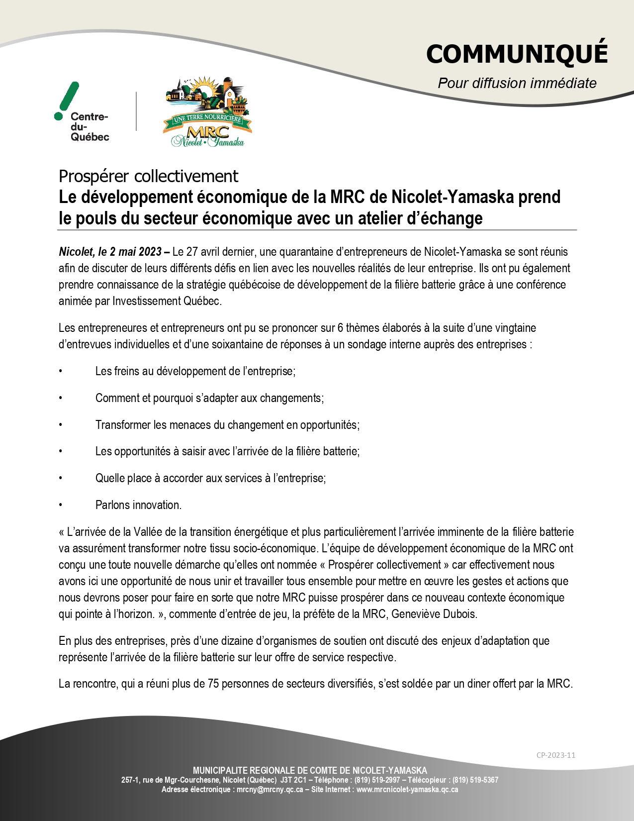PROSPÉRER COLLECTIVEMENT : LE DÉVELOPPEMENT ÉCONOMIQUE DE LA MRC DE NICOLET-YAMASKA PREND LE POULS DU SECTEUR