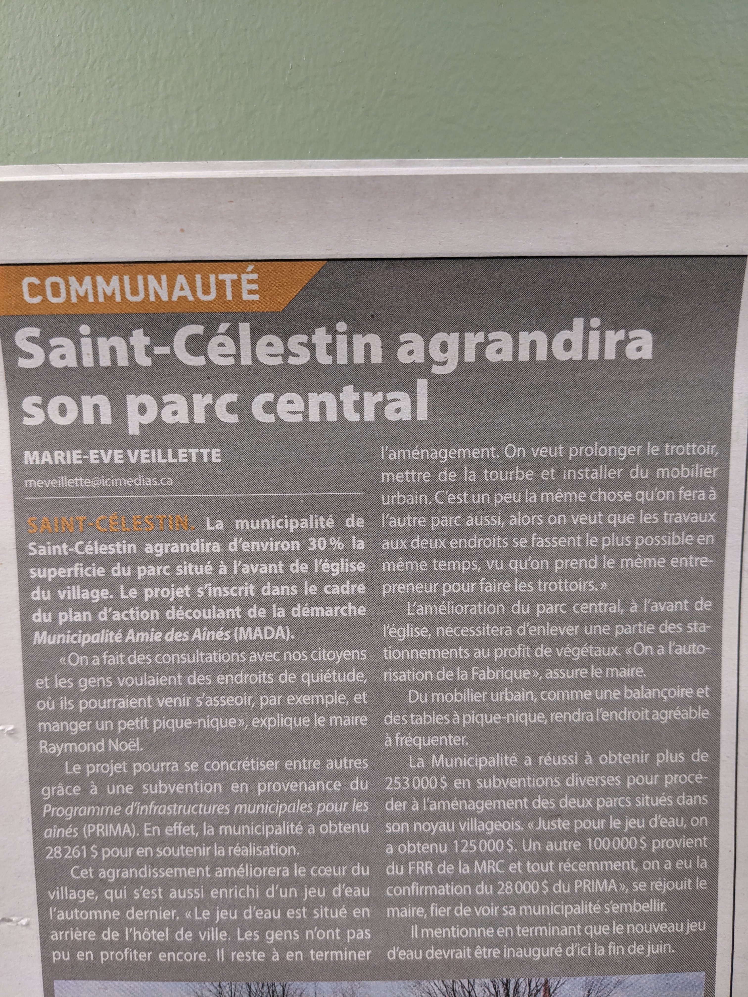 Le Village de Saint-Célestin agrandira d'environ 30% la superficie du Parc central situé à l'avant de l'église. Le projet s'inscrit dans le cadre du plan d'action découlant de la démarche Municipalité Amie des Aînés (MADA).