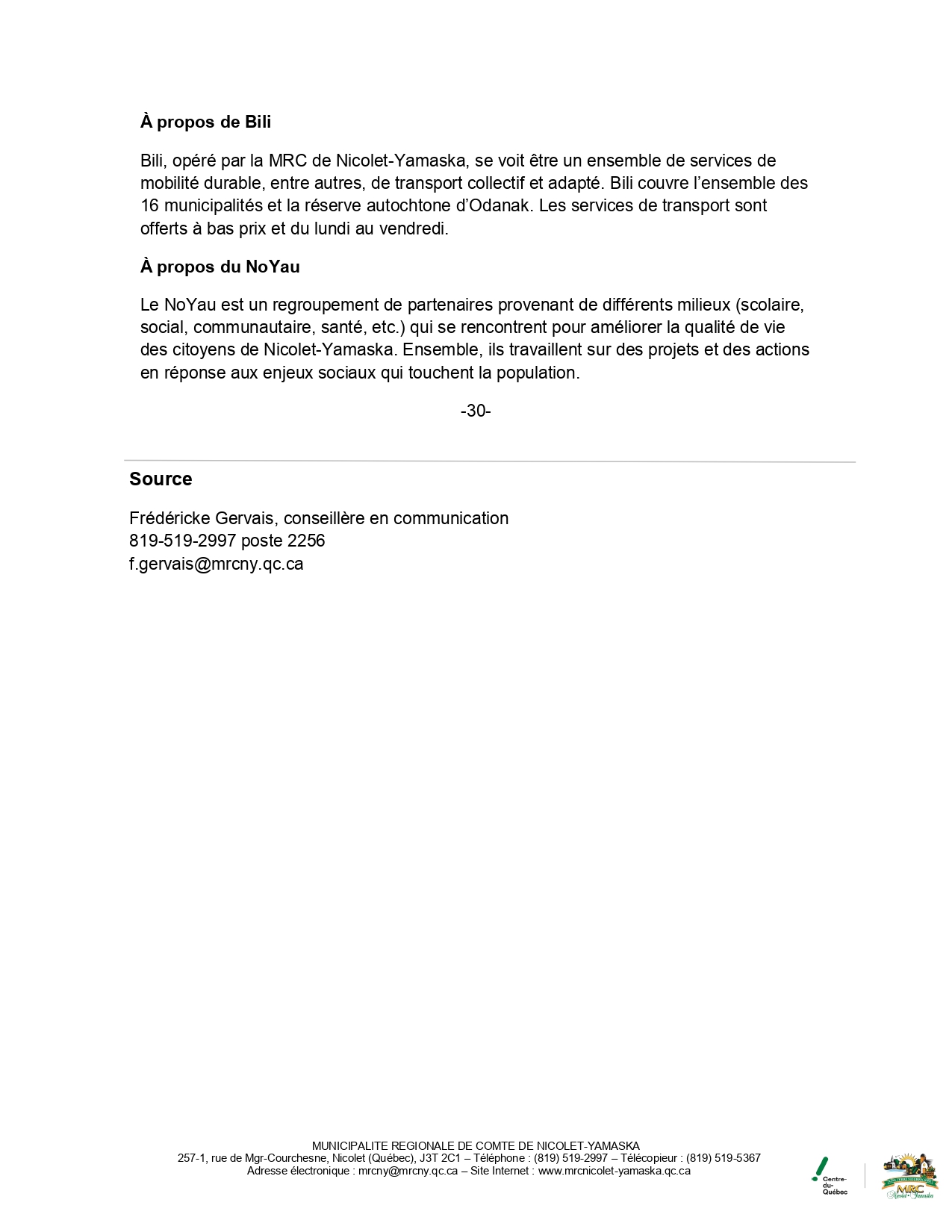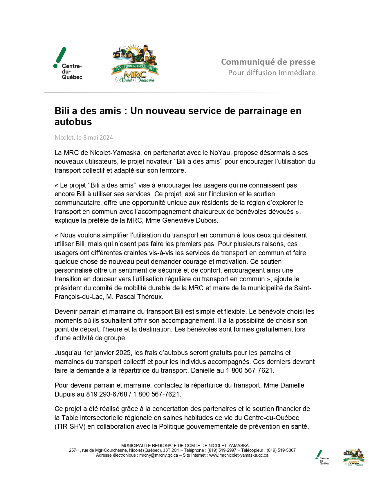 La MRC de Nicolet-Yamaska, en partenariat avec le NoYau, propose désormais à ses nouveaux utilisateurs, le projet novateur ''Bili a des amis'' pour encourager l'utilisation du transport collectif et adapté sur son territoire.