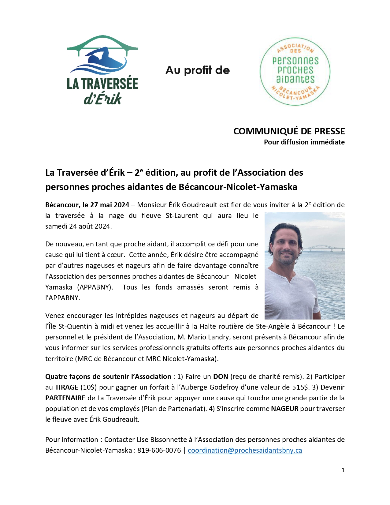 De nouveau, en tant que proche aidant, il accomplit ce défi pour une cause qui lui tient à c?ur. Cette année, Érik désire être accompagné par d'autres nageuses et nageurs afin de faire davantage connaître l'Association des personnes proches aidantes de Bécancour - Nicolet-Yamaska (APPABNY). Tous les fonds amassés seront remis à l'APPABNY.