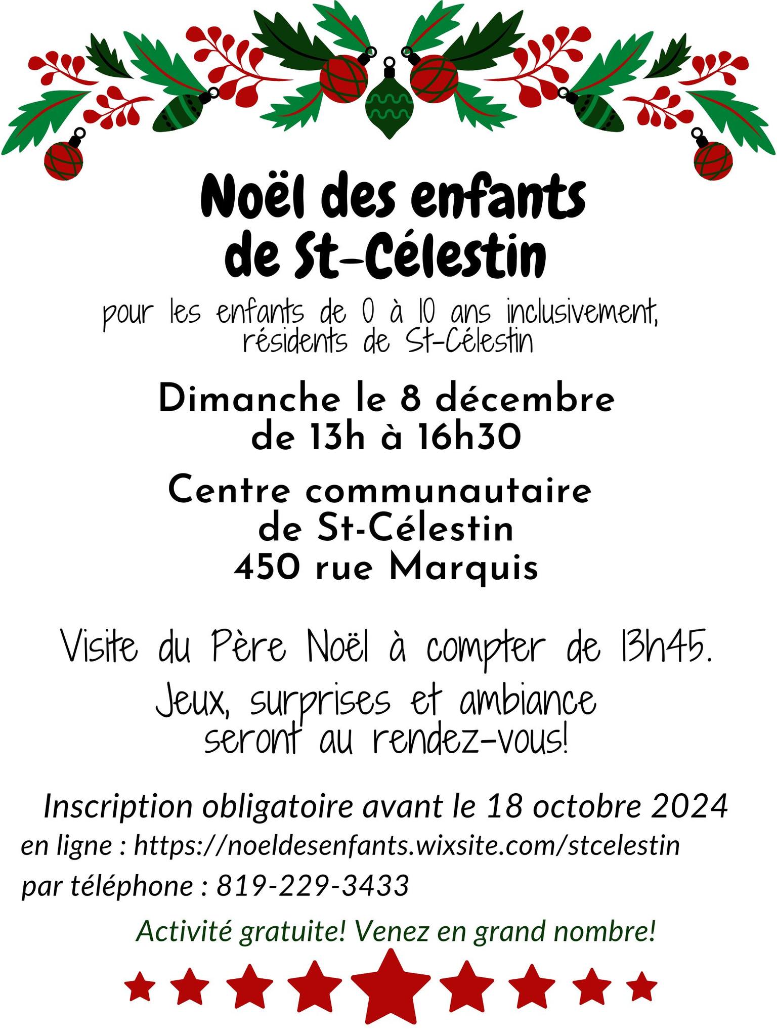 Cette année, le Noël des enfants aura lieu dimanche le 8 décembre de 13h à 16h30 au Centre communautaire situé au 450 rue Marquis. Notez que l'inscription est obligatoire avant le 18 octobre 2024 par téléphone au 819-229-3433 ou en ligne : https://noeldesenfants.wixsite.com/stcelestin