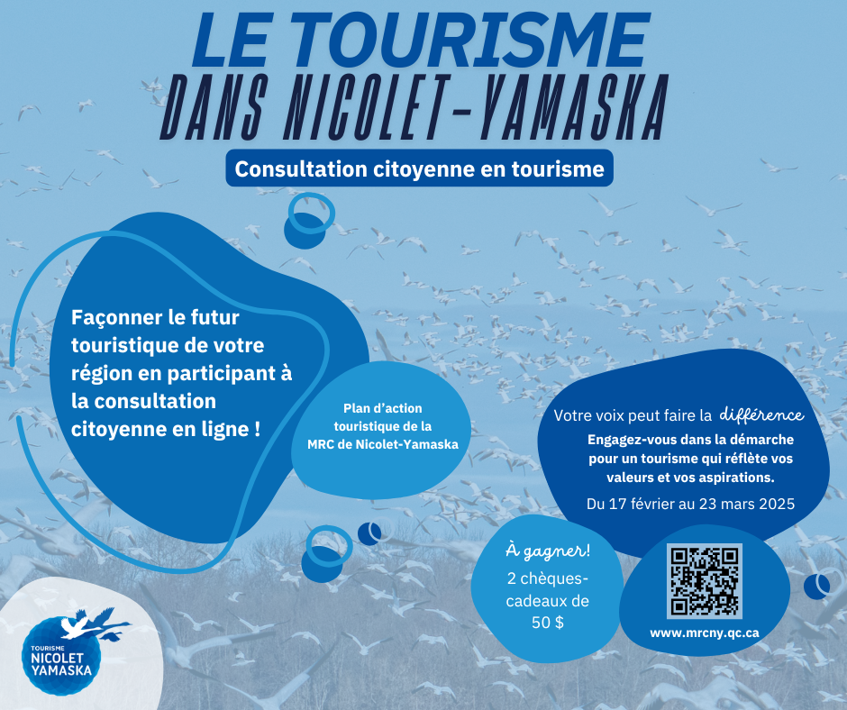 La MRC de Nicolet-Yamaska vous invite à partager vos idées pour l'avenir du tourisme dans la région. Grâce à ce sondage, nous pourrons mieux cerner les besoins de la population et bâtir un tourisme qui bénéficie à tout le monde.