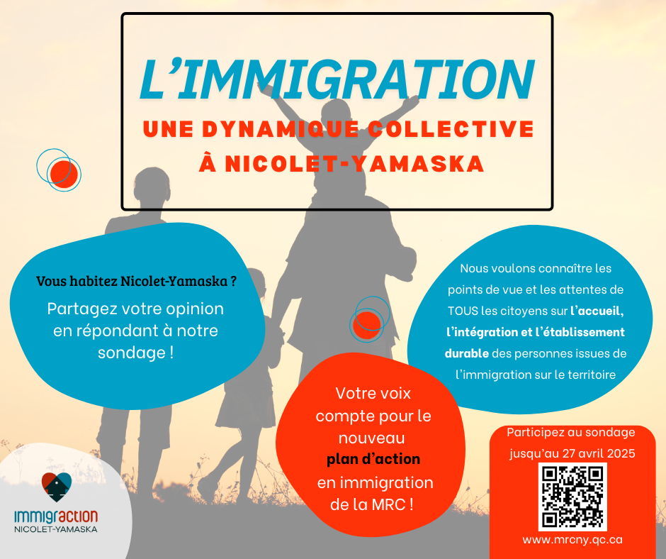 Personnes issues de l'immigration, citoyens, entreprises, organisations de soutien et d'accompagnement, municipalités et élus, votre opinion compte ! Nous vous invitons à répondre au sondage de la MRC de Nicolet-Yamaska pour aider à bâtir un territoire plus inclusif.