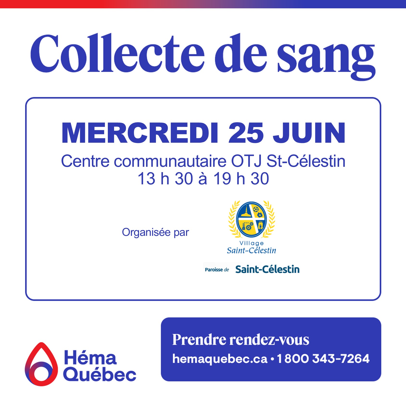 Collecte de sang mercredi 25 juin 2025 au Centre communautaire de Saint-Célestin de 13 h 30 à 19 h 30.